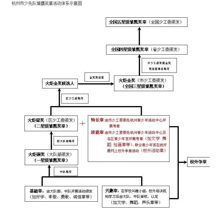 火炬银奖:即全国二星级雏鹰奖章,区级少先队员最高荣誉,是由共青团区委、区教育局、少先队区工作委员会联合颁发的。